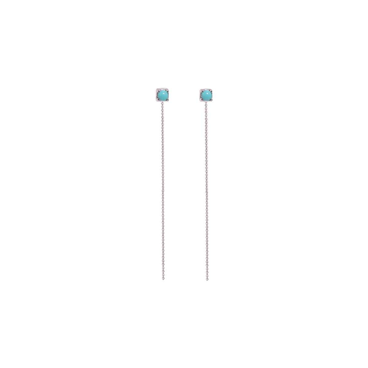 Earrings in whitegold with turquoise cabochons Ø 2,20 mm. You can wear them with the chain or without. Great studs to wear for the second earhole! The chain gives it a special flair!